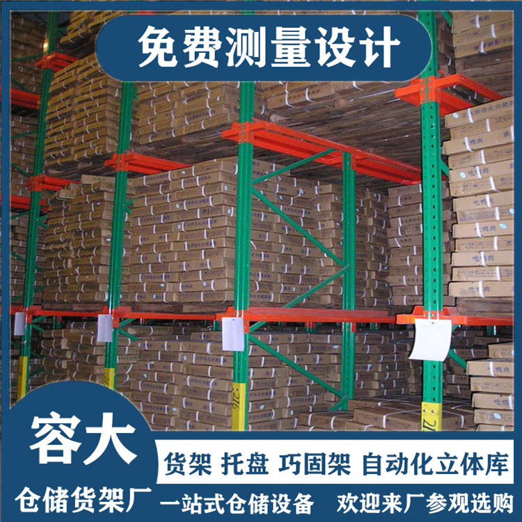 駛?cè)胧截浖苡芍?、牛腿、牛腿隔板、頂梁、頂拉、背拉等組成。是一種不以通道分割、連續(xù)性的整體性貨架,貨架采用托盤存取模式,在支撐導軌上,托盤按深度方向存放。